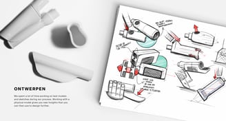Transforming principles into a feasible product requires a substantial design effort. The product's size works to its advantage, facilitating swift testing with (**mock-up**) models after a few initial sketches. These models are tested and compared against the requirements, yielding insights that inform a new design iteration towards the final product.